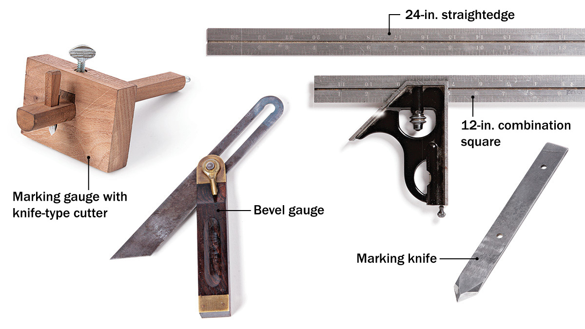 Used often with the combination square, a marking knife performs the layout tasks that the marking gauge can’t handle, leaving the same crisp, incised line. I like a double-beveled tip, which cuts in both directions.