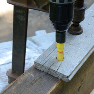 Position the template over the stuck fastener, clamp it securely to the reclaimed board, and begin drilling. The boring cylinder will cut a core of both the fastener and the surrounding wood. Applying a lubricant like Boelube will reduce friction and help extend the tool’s life.