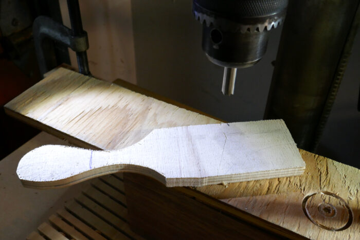 First, clamp a scrap board to the drill press table and attach the HSS boring cylinder inside the chuck. Then drill the template to create the drilling guide. Since most boring cylinders’ exterior diameter matches common drill sizes (½ in. and ⅜ in.), you can use a matching drill bit to shape the template’s hole. In this case, just find and drill a scrap; there is no need for a drill press setup.