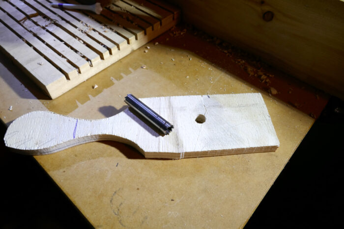 Once the core is fully formed, remove the boring cylinder from the chuck and push the core out using a golf tee or a wooden dowel. If the core is still attached to the reclaimed wood at the bottom, break it free using pliers, a screwdriver, or an awl.