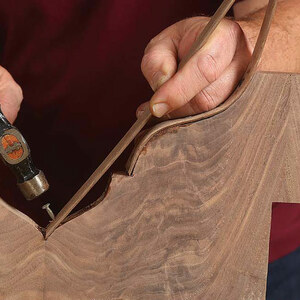 One of the most basic cutting methods of making marquetry is the window method. After drawing the pattern, the first step is cutting out the panel from the base veneer. This can be done using a knife or a scrollsaw. In general, the knife is better for straight lines, while the saw comes in handy for cutting curved lines. Working with the saw, alter in that the inlay is cut along with the base, providing a perfect fit (in case of double-bevel technique). At the same time, cutting with a knife has an additional step—that is, marking the veneer used for inlay with the knife (not cutting through first). After cutting the inlay, it can be fit into the base and fixed with veneer tape on the back of the base veneer. This process repeats itself till the last panel finds its place on the picture.