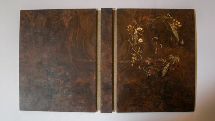 For increasing their durability, marquetry pictures need to be pressed to a wooden board. In this case, I pressed the picture onto a board of homemade plywood containing one 1.5-mm-thick mahogany and two 0.6-mm-thick American walnut veneer sheets. I decided to use this plywood to minimize the deflation of the cover that comes with veneering. Plywood is built from sheets with rotated grain direction that extinguish the wood movement of the particles very well.