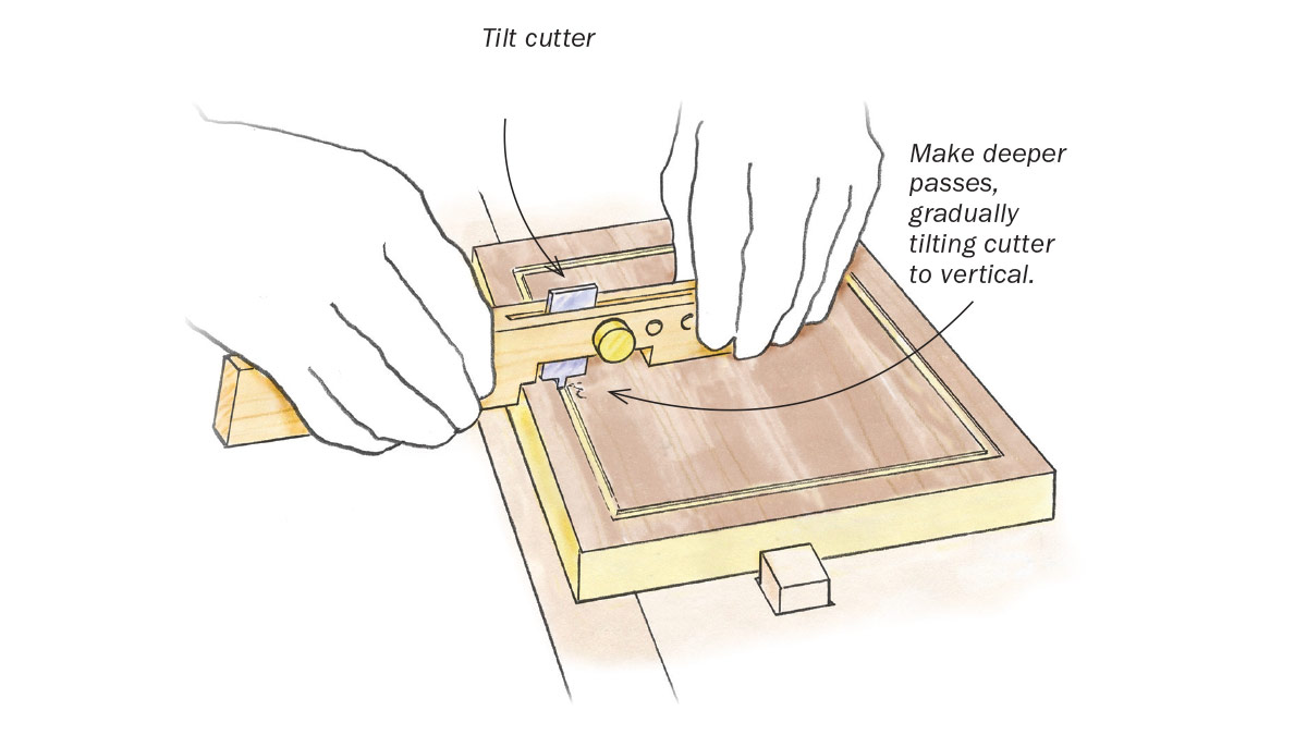 clamping pressure. To use the tool, tilt it backward at first, like a scraper blade, and lower it until it just scores the wood. Make additional passes as needed, gradually bringing the cutter up to 90°.