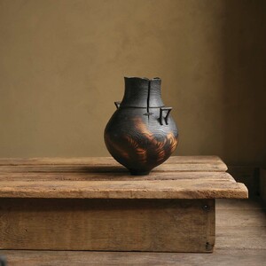 Over the years, Max has refined his opinion of the “right” profile. The widest part of a pebble is usually in the middle and therefore it is rather static: having the widest point below the center elevates the piece, gives it a sense of dynamism. So, take the pebble shape, “pucker in the bottom, lower the wide point, taper the top.” The front-on profile of a Galway hooker, a traditional West of Ireland sailboat, excites him, and he will sometimes place one of his Pebble Vessels beside a photograph of the boat to compare their shapes.