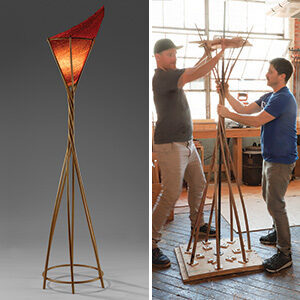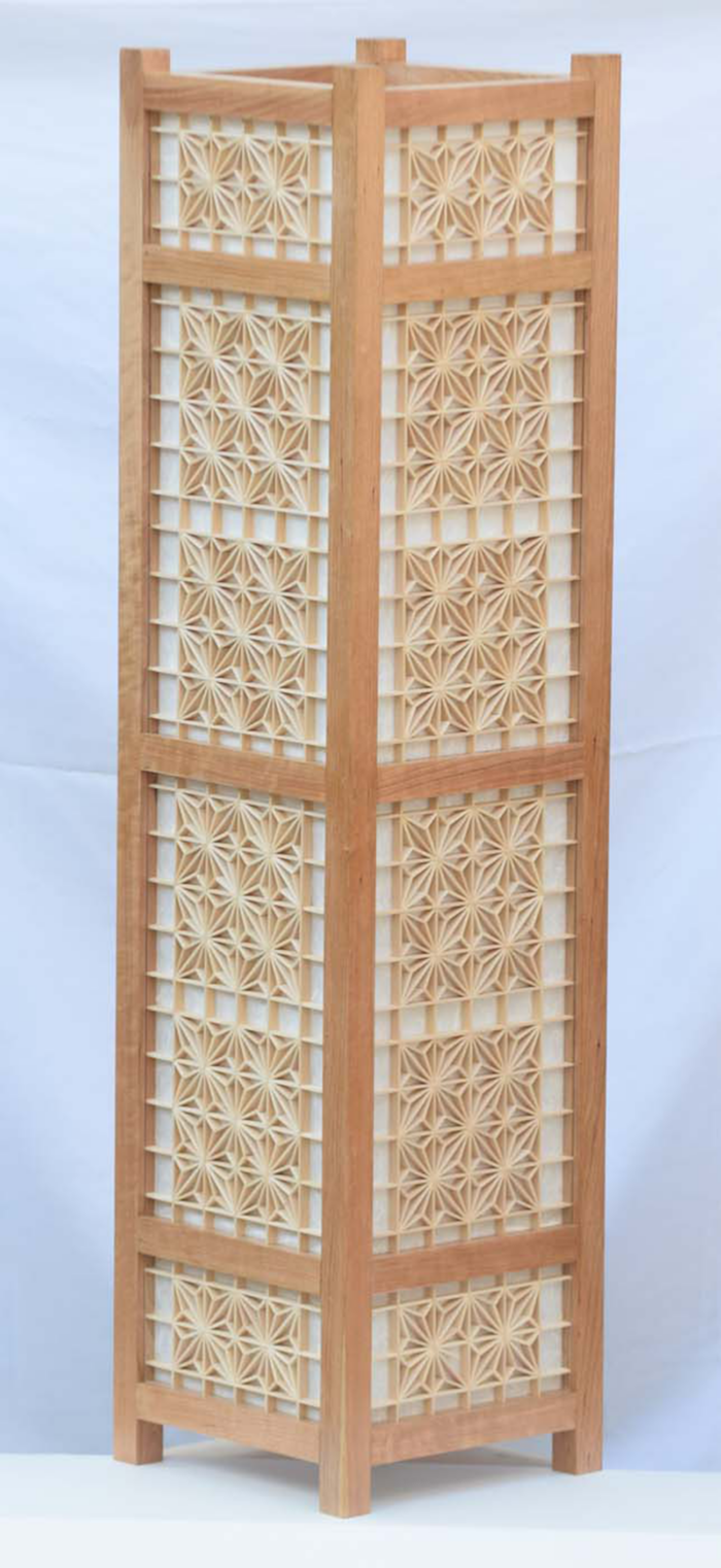 After building a Kumiko bookcase, Ken was hooked on the technique and designed and built this floor lamp constructed of over 2,400 pieces. After studying numerous Kumiko patterns, he came back to the popular Kakuasa hemp-leaf design. The lamp holds three LED tubes. KEN MACDONALD, Southern Pines, N.C.