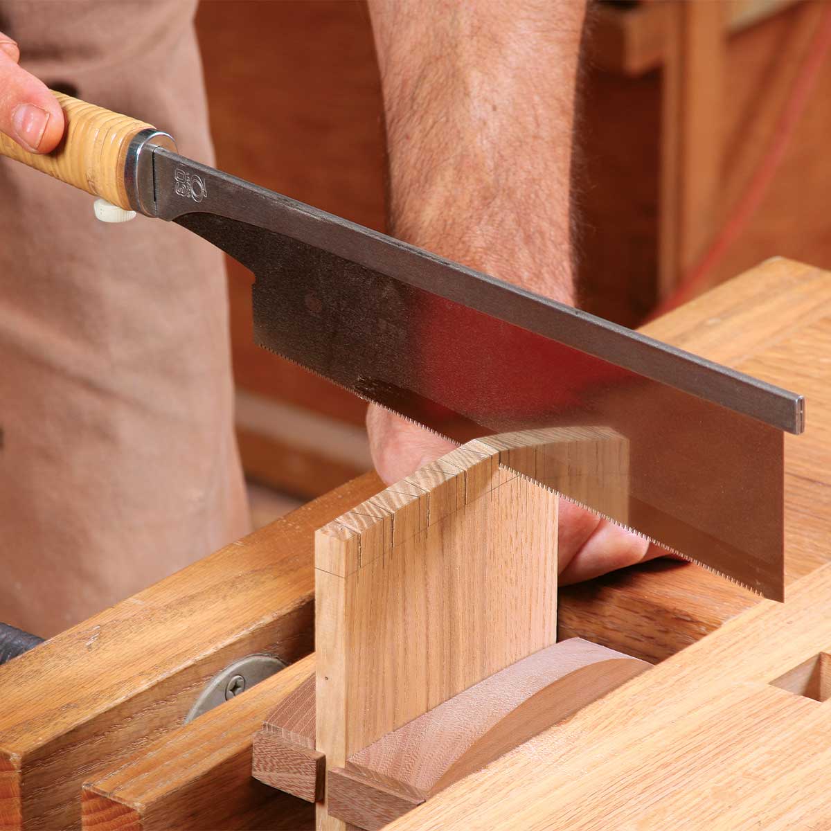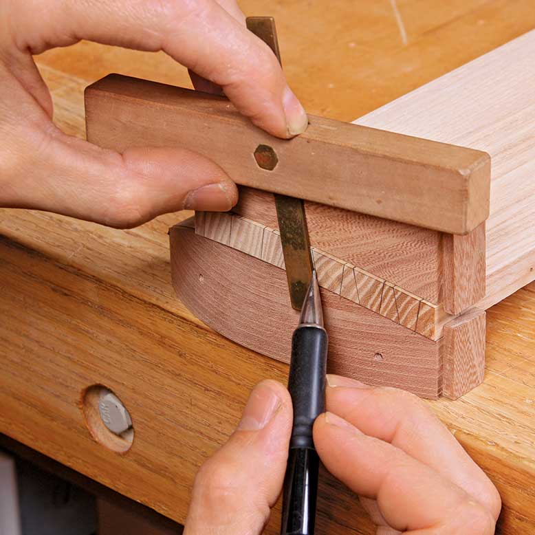 The answer is a pair of hardwood blocks that sandwich the workpiece. Each block has a straight edge that lets you lay out the dovetails. Nested around the workpiece, they can be clamped in a vise, so you can saw the pins and tails. Also, they can be used as a chisel guide when you’re cleaning out the waste. I’ll show you how to make and use the blocks, including some tips on laying out and cutting dovetails on curved parts.
