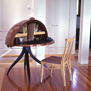 Osgood’s shell desks stand among the most aesthetically expressive and technically impressive American pieces made in the 20th century. About them, he said, “I’ve felt freer with the desk form than the chest of drawers, which is a more definite mass; the chest is a solid form, whereas the desk can have open areas to balance the solid ones. The desk is a haven for sculptural forms.” One aspect of designing his shell desks presented an ongoing puzzle. “I realized early on there were two separate compositions: the desk when it was closed, and the desk when it was opened. I spent a long time working on the insides as a definite form in itself. Maybe some of the interiors I’ve done are too separate. You know, when you cut a seed pod open there’s a structure inside there that is itself but is very much in harmony with the outside form of the pod. So I think I have some studying to do there.”