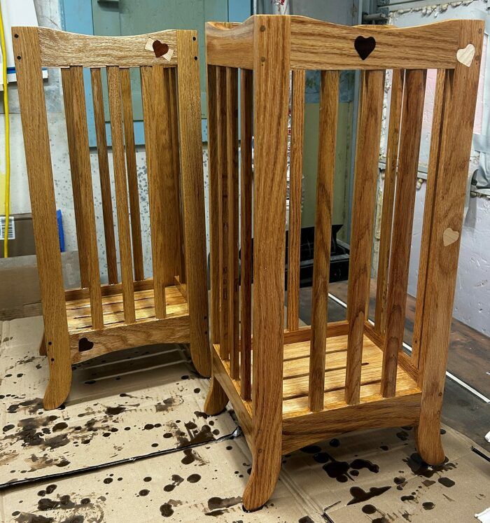 For various reasons I chose to use a penetrating epoxy on these cane/umbrella stands as a “finish”. While It’s only the second time I’ve worked with epoxy for reasons other than an adhesive, I was well aware of its “challenges”. Things seemed like they were going well, when I was almost done with the first coat on the first one. I noticed that my foam brush was feeling a bit warm, then I noticed that it was melted, and then I noticed some smoke rising from the mixing cup. I had some thermal runaway occurring. After I had a quick check of the working conditions of my heart as I saw within my vivid imagination, images of my small shop(while only a millisecond it seemed like an eternity) and house going up into flames along with the bit of heat my hands got to feel as I dashed outside with cup in hand, I get to do a safety check. I’m normally a cautious guy and take safety seriously so why I didn’t have a bucket of water next to my table, knowing that thermal runaway is a risk for epoxy, I do not know.