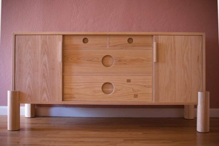 Paul designed this piece for and with the help of good friends who wanted something modern but playful for their living room. The drawers and divider techniques were lifted from Tom McLaughlin’s master class in building a Shaker chest of drawers. The lumbercore process is Tim Coleman’s. The sliding door layout is from Seth Janofsky. The L-tenon and perfect miter method was from Tim Rousseau. PAUL BEEMAN, Albuquerque, N.M.