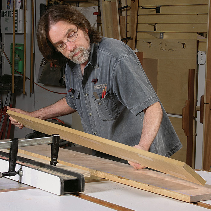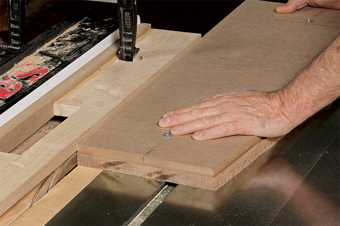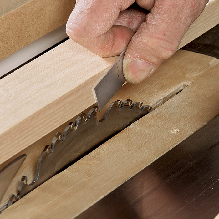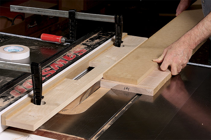 Once you have the fence set up as shown on the opposite page, and you’ve cut the sides to final size, you attach straightedges flush to the edges. I cut the opposite side of my straightedges at 45° so they’ll work as clamping cauls during assembly. With the fence and blade set up as shown, run the case sides so the straightedges bear against the L-fence.