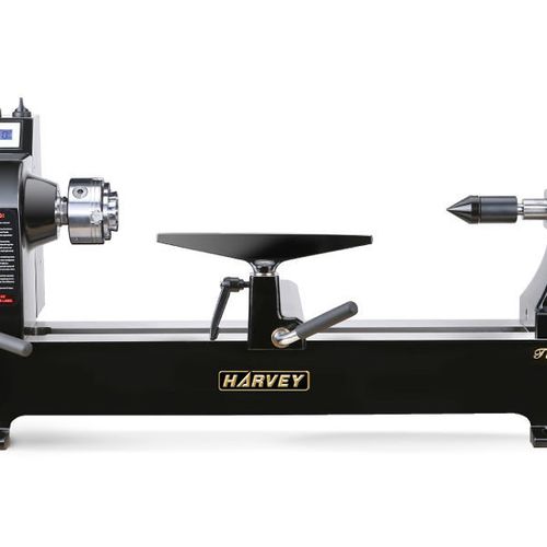 The Harvey Turbo, the only lathe in the group to come wired 220 instead of 110 and supplied with a 6-20p plug, is fairly well built. The bed, headstock, and tailstock are substantial and the extra weight keeps the lathe stable and helps to absorb vibration. The provided tool rest is of reasonable quality and ergonomic. There was no creeping or excessive vibration during use. The motor on this lathe is much smaller in size than the other lathes in this review, which can hinder performance. The electronics and controls take up a lot of room behind the headstock and get in the way during use. They are also among the most complex I’ve seen on a commercial lathe. Out of the crate, all the components were coated in thick grease. Many applications of solvent were needed to remove it.
