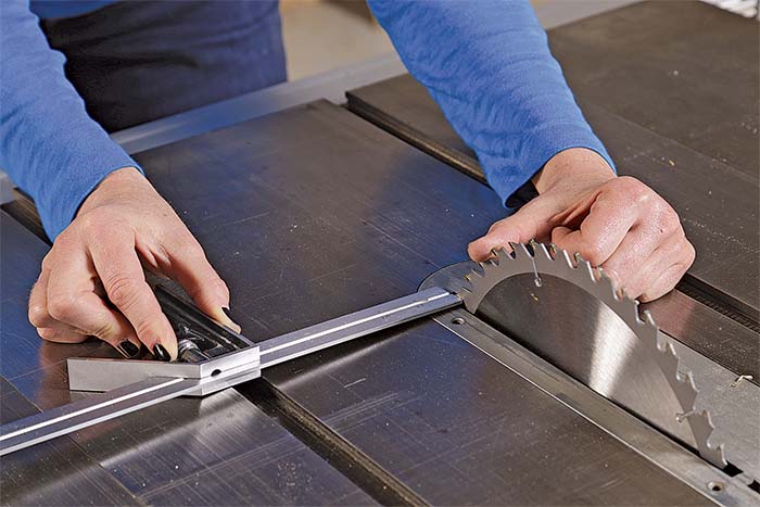 Now that the blade is at 90°, you’ll adjust the tabletop so the miter-gauge slots are parallel to the blade. Put the square’s head against the left side of the right-hand slot and the ruler at the front of the blade. Carefully slide the ruler out toward the blade until it lightly rubs a tooth. If you’re using a rip blade, pick any tooth. If the blade’s a crosscut or combination, pick a rip tooth or a tooth angling to the right. Once the ruler slightly touches the tooth, lock the square in that setting.