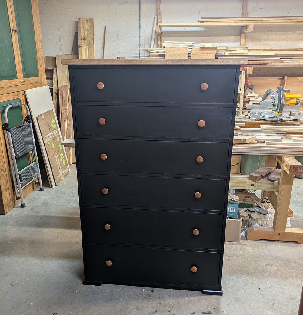 The second dresser is made of solid wood, primarily poplar. It is stained black and finished with black polyurethane. It has an oak top and matching oak drawer pulls. It was built with the traditional method using drawer frames.
