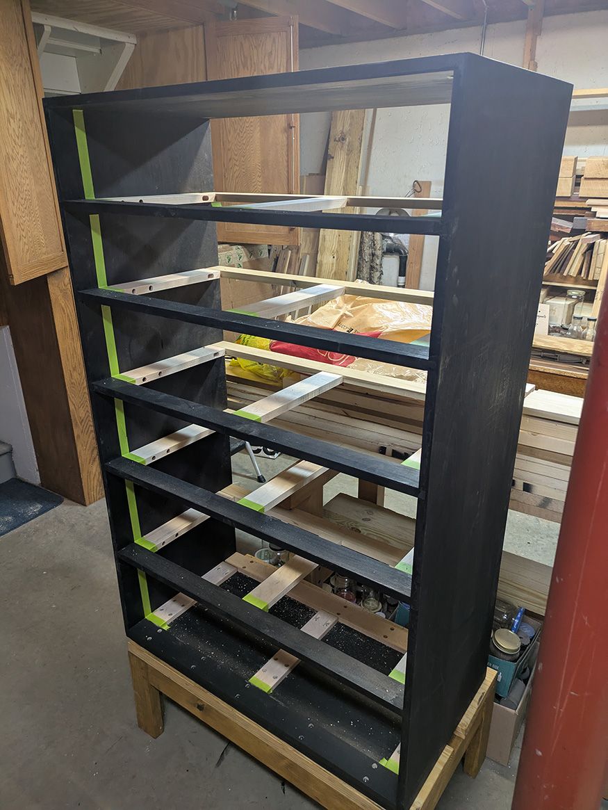 The first dresser was made of plywood and used metal drawer slides and silver metal knobs.. I built it as my granddaughter ,Emma, –an IKEA fan –asked me to build it at a [COVID] time when good materials were scarce. The dresser was painted entirely with black cabinet paint.